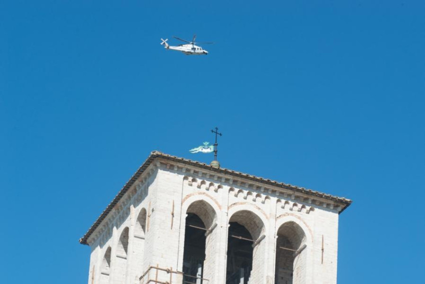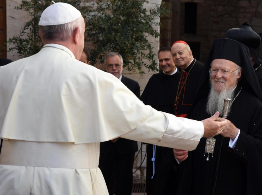 Délelőtt fél 11-kor indult a pápa a Vatikánból helikopterrel. A Santa Maria degli Angeli sportpályájáról fél 12-kor közvetlenül az assisi Szent Konventbe ment, ahol Bartholomaiosz konstantinápolyi pátriárka, II. Ignác Efrém, Antióchia szír ortodox pátriárkája, Justin Welby anglikán prímás, Riccardo Di Segni római főrabbi és Abbász Shuman, a kairói al-Azhar egyetem és szunnita vallási központ elnökhelyettese fogadta.