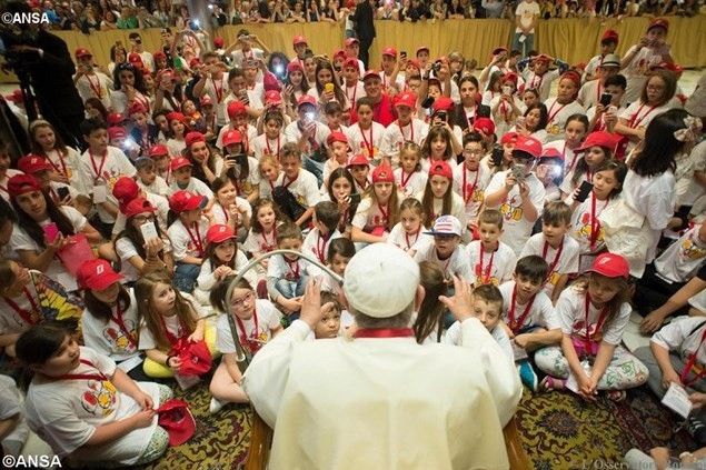 Ferenc pápa a VI. Pál-terem átriumában találkozott a gyerekekkel, és játékosan elbeszélgetett velük. Amikor megkérdezte őket, hogy az álmok szárnyán el lehet-e jutni nagyon messzire, a gyerekek kórusban válaszolták, hogy bárhová.