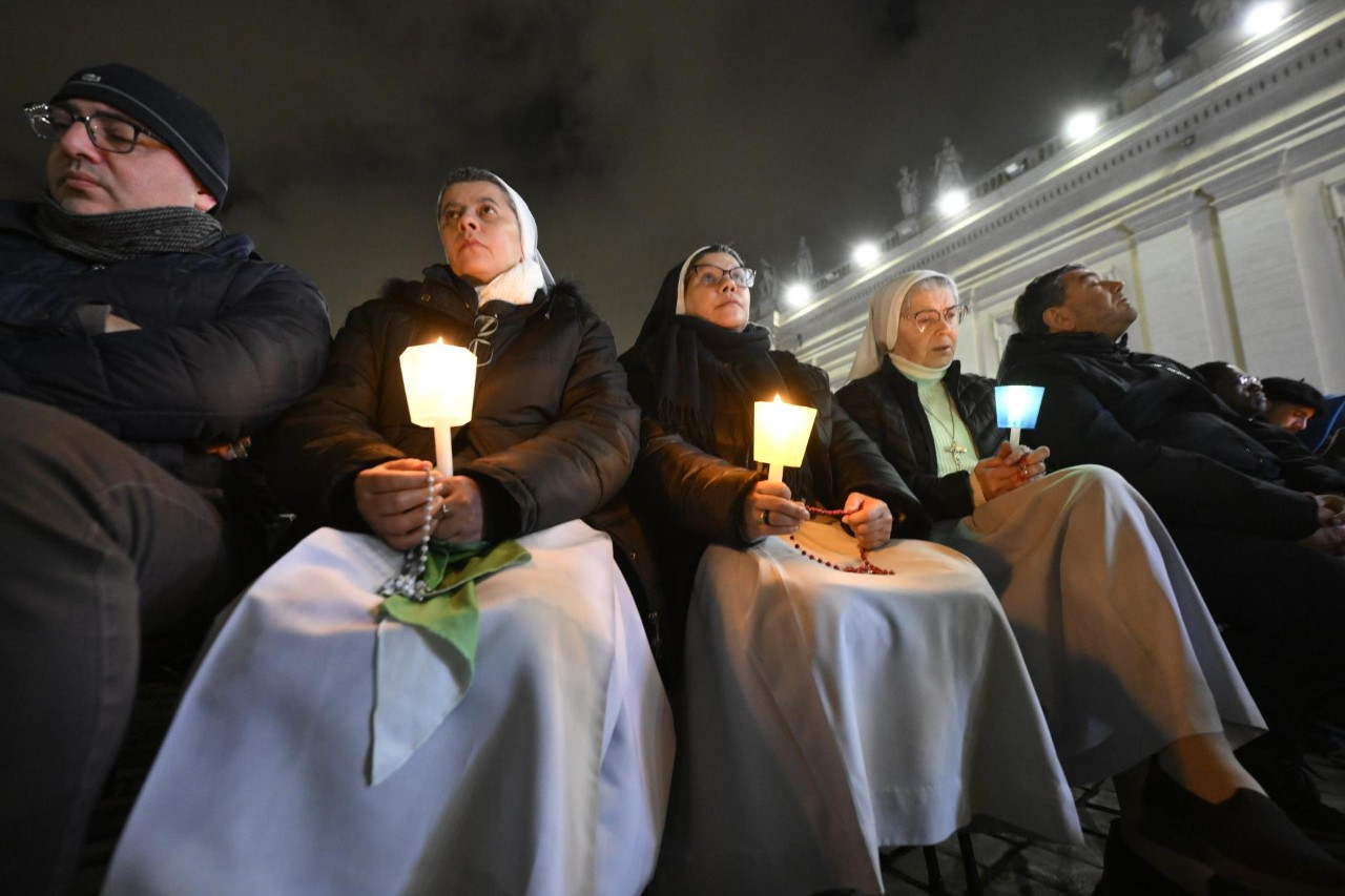 A Szent Péter téren bíborosok, papok, szerzetesek gyűltek össze, világi hívek a világ legkülönbözőbb szegleteiből, fiatalok, idősek – Isten népe a maga sokféleségében egyesült a hitben a fájdalmas rózsafüzér titkain elmélkedve. Az evangéliumi szakasztól a Miatyánkig, az Üdvözlégy Máriáig az imádság áhítattal teli csenddel váltakozott. Lehunyt szemmel vagy a Mária-ikonra szegeződő tekintettel imádkoztak az egybegyűlt hívek, az Egyház Anyja ikon fénye mintha pedig beragyogta volna Bernini-oszlopsor ölelésében fohászkodókat.