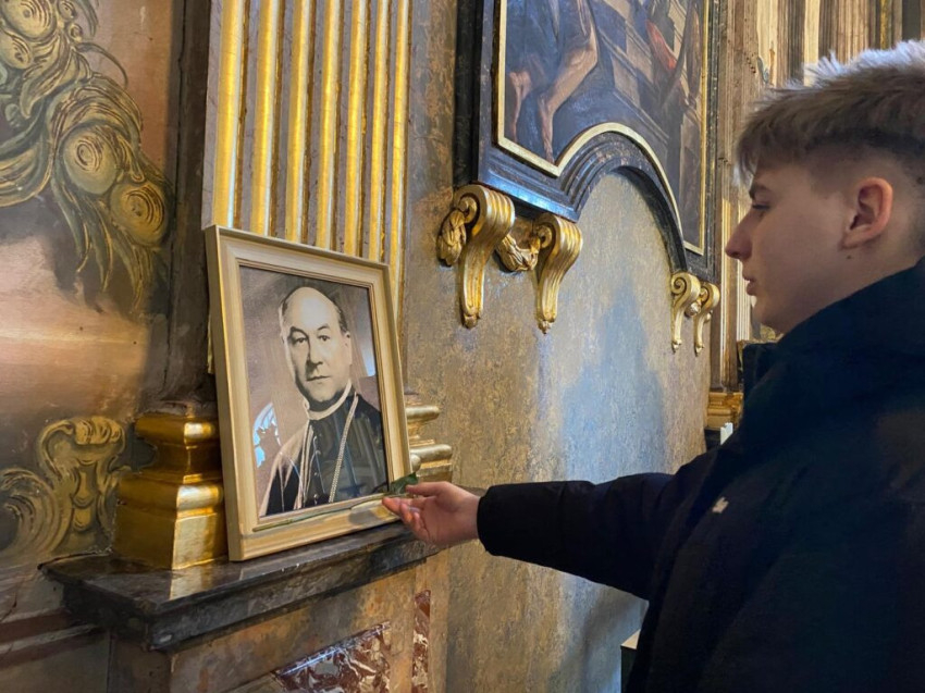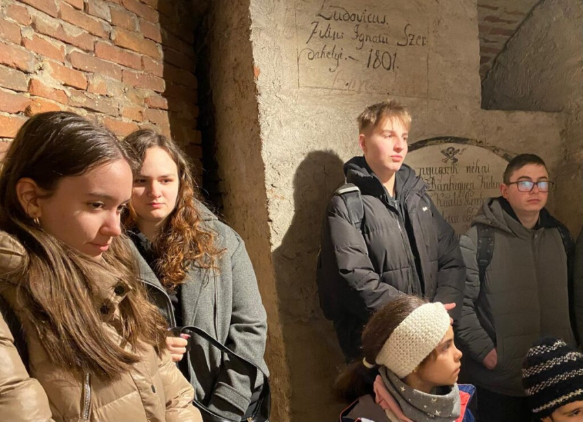 A zarándoklat utolsó állomása a Barátok templomának kriptája volt, ahol a fiatalok Györgypál Albert sírja előtt tisztelegtek, imádkoztak, és elhelyezték a kegyelet virágait.