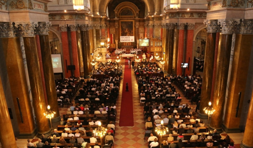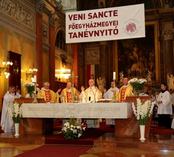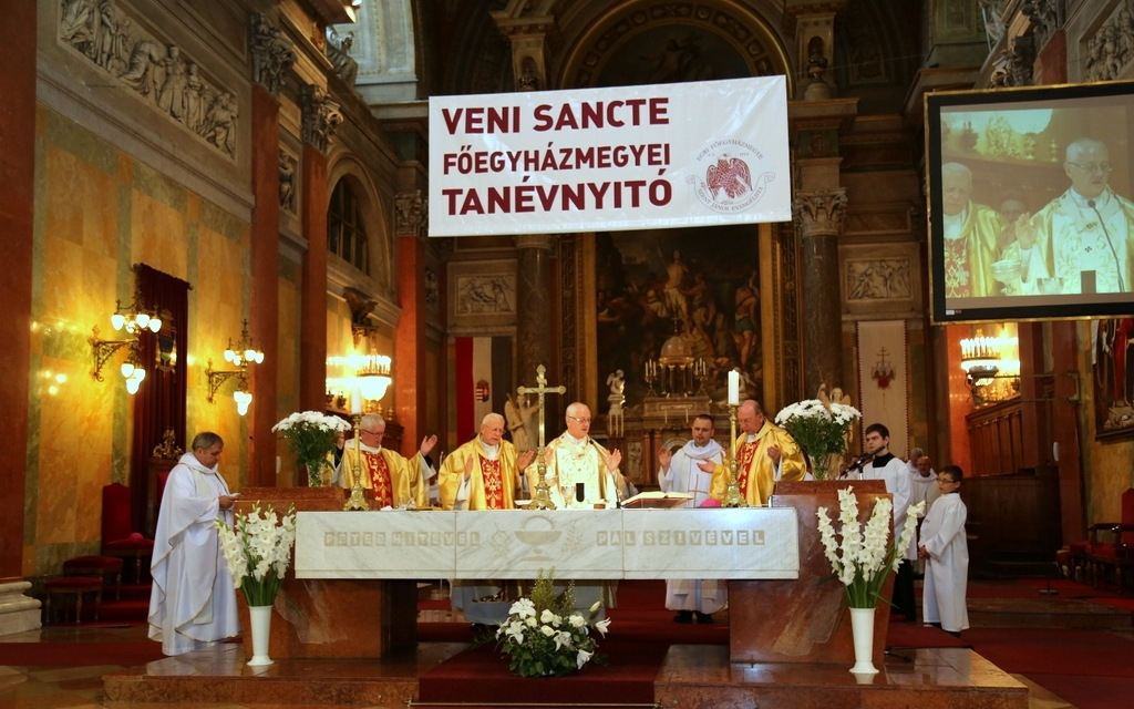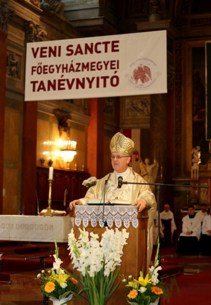 Az előadásokat követő szentmise a Jöjj, Szentlélek Úristen kezdetű énekkel kezdődött. Ternyák Csaba egri érsek szentbeszédében elmondta, a főegyházmegye köznevelési-közoktatási intézményeiben összesen 18 ezer fiatal tanul. A pedagógusok feladata, hogy segítsék kibontakozni azt a tehetséget, amely ott lapul bennük. Krisztus, a jó pásztor megvédi, ismeri és életét adja a nyájáért. Az ő példáját ajánlotta a főpásztor a pedagógusok figyelmébe, majd így fogalmazta meg feléjük kérését: tanítsuk meg a fiatalokat az élet tiszteletére és szeretetére. Mutassuk meg nekik, hogy az élet érték, amelyet meg kell becsülni, nem szabad veszélyeztetni. Aki megtanul másokért élni, boldog lesz és értékesnek érzi az életét. A katolikus iskolákban neveljük őket tudatosan az egészséges életre, tanítsuk meg őket a felelős közlekedésre, a világháló helyes használatára. Segítsünk nekik abban, hogy képesek legyenek elviselni a sikertelenséget. Vértezzük fel őket ismeretekkel. S ha el tudjuk őket vezetni a vallásos élethez, akkor olyan kapaszkodót adunk nekik, amely a legnehezebb buktatókon is képes átvezetni az embert.