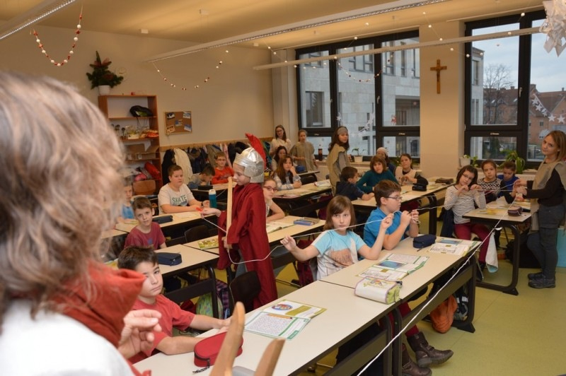 Wächterné Lakatos Ágnessel a bemutató órán néhány feladatot oldottak meg a diákok. Egy szójáték kitöltése után be is öltöztek hittanulónak, remetének, szerzetesnek, katonának, püspöknek – a Szent Márton életében megkülönböztetett életszakaszoknak megfelelően. A feltett kérdésekre adott válaszokból kiderült, a gyerekek jól ismerik Márton életét.