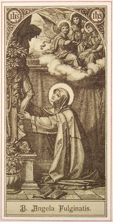 1291-ben tett fogadalmat, majd elzarándokolt Assisibe. A zarándoklat során rendkívüli tapasztalatai voltak a Szentháromság jelenlétéről. Misztikus élményeit gyóntatója, Fra Arnaldo foglalta írásba, fordította latinra és terjesztette elő kivizsgálásra. A tanítást aztán nyolc minorita teológus hagyta jóvá. Ezt követően Angéla misztikus élményei ritkábbak lettek, de Szent Ferenc ígérete szerint lelki család kezdett köréje gyűlni. A teológusok körében olyan nagy volt a tisztelete, hogy „magistra theologorum” (a teológusok mesternője) címmel tisztelték meg.