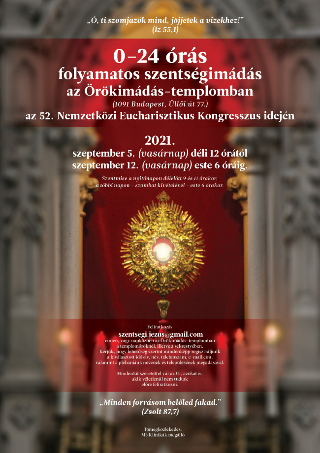 A szentségimádásra előzetesen feliratkozni a szentsegi.jezus@gmail.com e-mail-címen, vagy napközben az Örökimádás-templomban (1091 Budapest, Üllői út 77.) a templomőröknél, illetve a sekrestyében lehet. A plébánia kéri, hogy lehetőség szerint mindenképp regisztráljanak a kiválasztott név, telefonszám, e-mail-cím, valamint a plébánia nevének és településének megadásával.