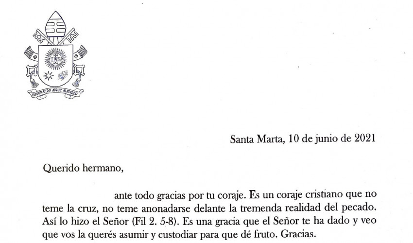 És ha megkísért az a gondolat, hogy Rómának ez a püspöke (testvéred, aki szeret téged) nem ért meg téged, amikor megerősíti küldetésedet és nem fogadja el lemondásodat, gondolj arra, amit Péter érzett az Úr előtt, amikor a maga módján benyújtotta lemondását: „Menj el tőlem, mert bűnös vagyok”, és hallgasd meg a választ: „Legeltesd juhaimat!”