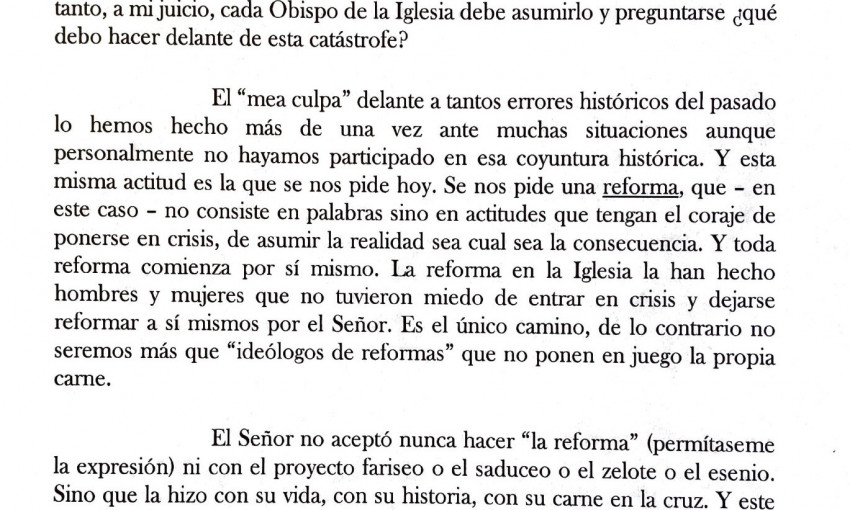 Nem mindenki akarja elfogadni ezt a valóságot, de ez az egyetlen út, mert az életünk megváltoztatására irányuló „elhatározások” anélkül, hogy „a húst a grillre tennénk”, nem vezetnek sehová. A személyes, társadalmi és történelmi valóságok konkrétak, és nem eszmékkel kell fogadni őket; mert az eszmékről vitatkozni lehet (és jó is, hogy így van), hanem a valóságot mindig fel kell vállalni és mérlegre kell tenni. Igaz, hogy a történelmi helyzeteket annak a kornak a hermeneutikájával kell értelmezni, amelyben történtek, de ez nem mentesít minket attól, hogy felelősséget vállaljunk értük, és a „minket ostromló bűn” történelmeként felvállaljuk őket. Ezért, véleményem szerint, az Egyház minden püspökének fel kell vállalnia ezt, és fel kell tennie magának a kérdést: „Mit kell tennem ezzel a katasztrófával?”