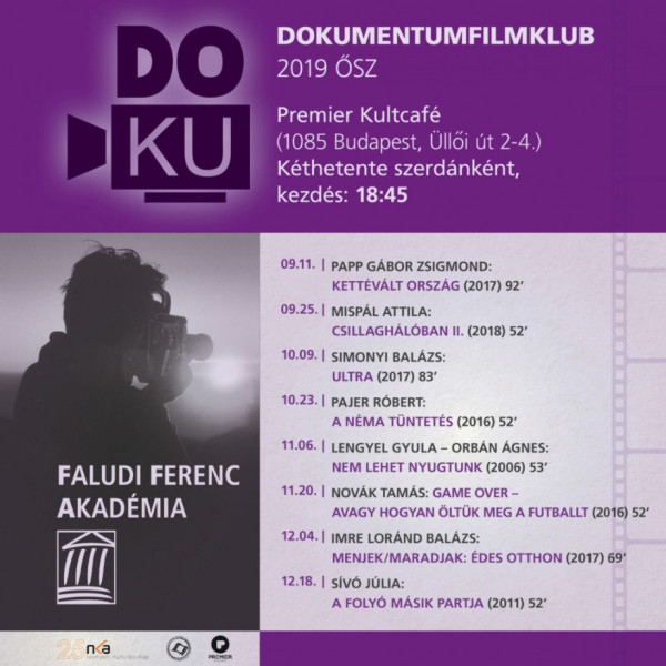 Szeptember 11-én kezdődik a DOKU Filmklub, amely az utóbbi másfél évtized hazai terméséből mutat be válogatást. Vetítik többek között Mispál Attila Pilinszky Jánosról szóló sorozatának második darabját, Papp Gábor Zsigmond Kettévált országát, Simonyi Balázs futófilmjét, az Ultrát, Sívó Júlia A folyó másik partja című, egy hajléktalanokból álló színjátszócsoport próbafolyamatát megörökítő alkotását, vagy Novák Tamás Game Over – avagy hogyan öltük meg a futballt című, a sportfogadás árnyoldalait bemutató művét is.