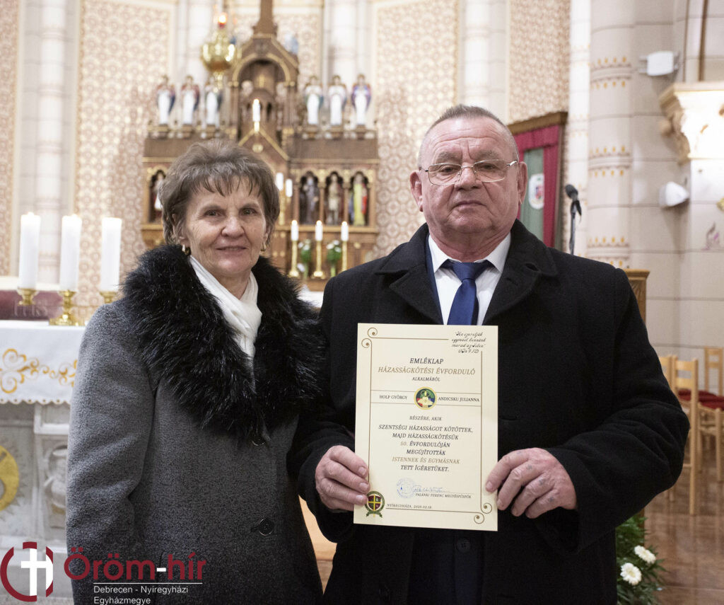 A szentmise végén az ünnepeltek a házasságuk évfordulójára kiállított emléklapot, és a Debrecen-Nyíregyházi Egyházmegye feliratával ellátott terítőt kaptak ajándékba, majd az ünneplés tovább folytatódott a plébánián a jó hangulatú, kötetlen szeretetvendégségen.