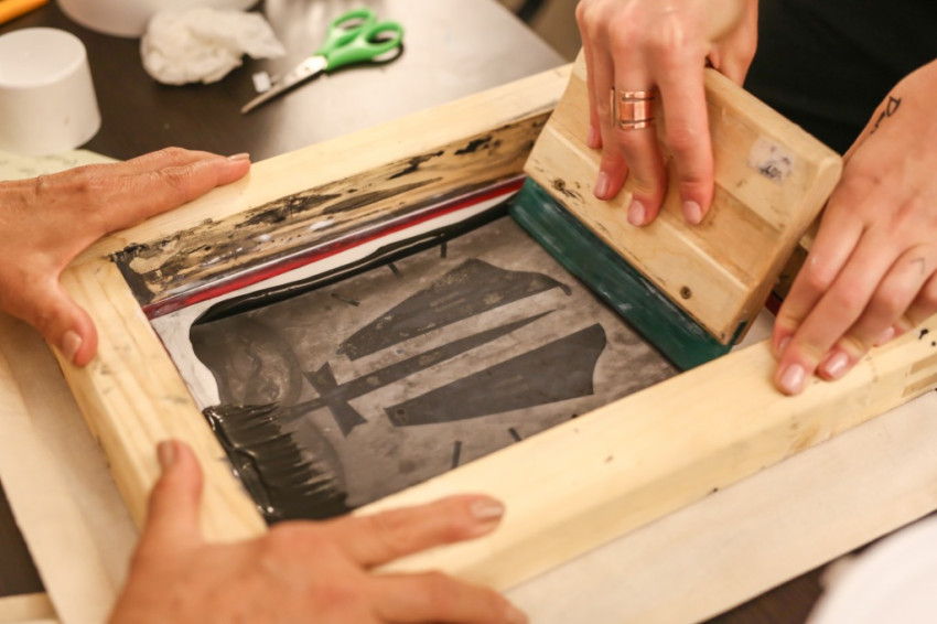 „Hiába csinálom hét éve, azért még mindig aggódom, hogy elrontom – mondja Pálma, míg a szita hátuljára ragasztja az elkészült mintát. – De ez a szép a kézművességben, hogy semmi sem egyforma.” Az alkotó fatáblára helyezi a kiválasztott és gondosan kisimított pólót, majd ráteszi a szitát, festéket kever, amit lassú mozdulatokkal egyenget el a rakli segítségével. Másodpercek múltán meg is jelenik Szent Márton üzenete a pólón, illetve a táskán, amit száradás után vasalással erősítenek meg a szöveten.