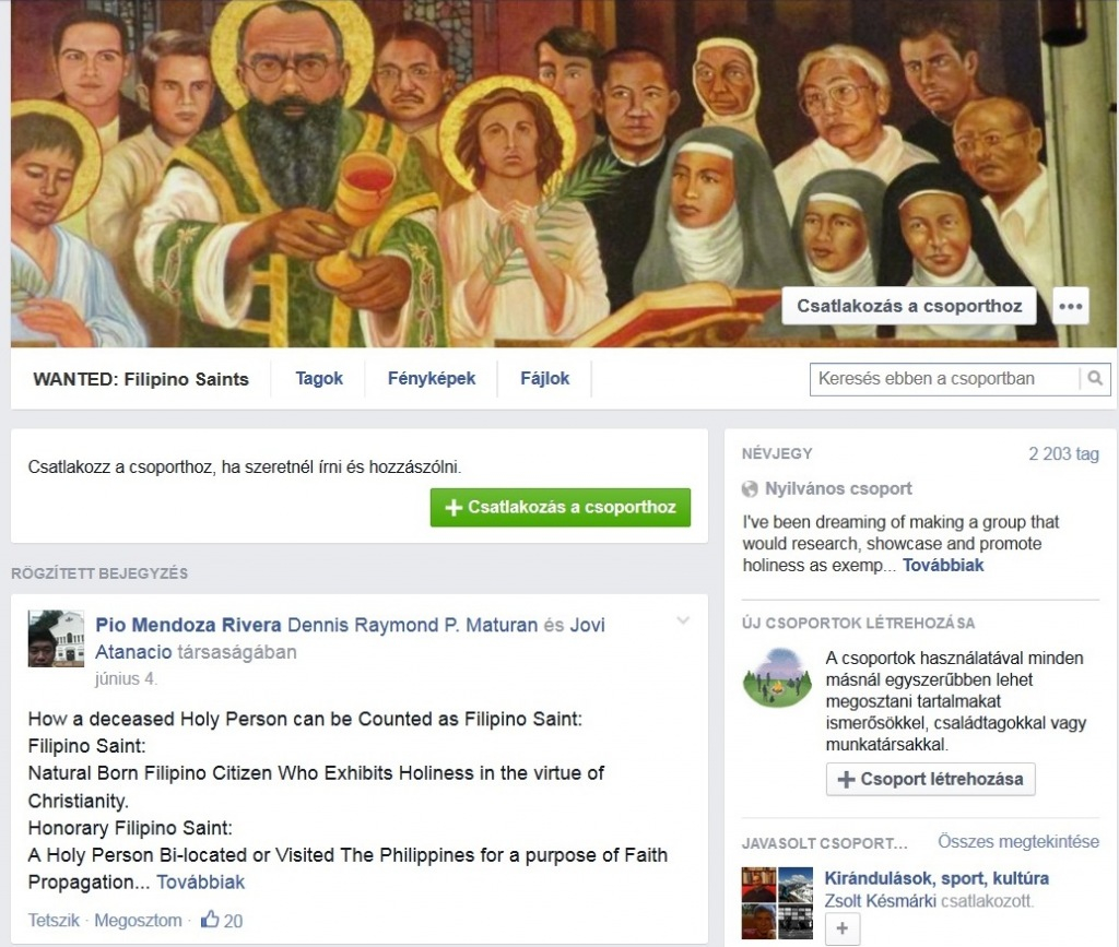 Látva a társadalom szétesését, katolikus példaképekre van szükség – fogalmazták meg a Fülöp-szigeteken annak a csoportnak az önkéntesei, akik kampányt indítottak szent életű katolikusok felkutatására és bemutatására. Jovi Atanacio, a Filippínó szent kerestetik elnevezésű Facebook-csoport vezetője számolt be a kampány indulásáról az ország püspöki konferenciájának híroldalán. Atanacio felhívásában arra szólítja fel a Fülöp-szigeteki embereket, készítsenek életrajzot, beszámolót olyan helyi vagy a Fülöp-szigetekkel kapcsolatot tartó emberekről, akik példaképként állíthatók a társadalom elé, s posztolják ezeket az anyagokat a Facebookon. Olyan személyeket keresnek, akiknek életpéldája és szolgálata méltó arra, hogy a szentté avatási eljárást elindítsák. A kampány szervezője már 1990 óta gyűjt anyagot potenciális jelöltekről.