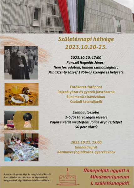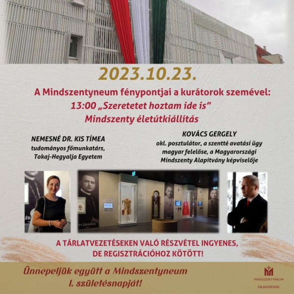 Október 23-án ugyancsak ingyenesen látogathatók a Mindszentyneum állandó kiállításai 10 és 18 óra között, ezen a napon a kiállítások kurátorai személyes történeteikkel színesítik a tárlatvezetéseket. A vezetéseken való részvétel előzetes regisztrációhoz kötött a korlátozott létszám miatt.