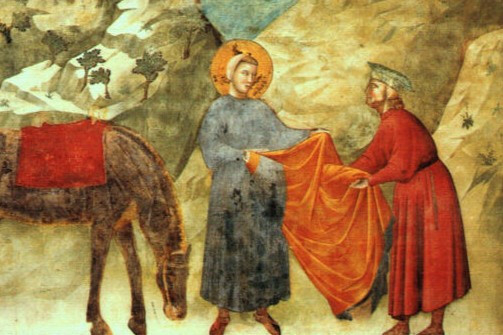 A fiatal Francesco itt még nem szegény szerzetes, de már nem is tekinthető annak az ifjúnak, aki az élvezeteket kereste. Ruhája egyszerűbb, mint egy nemesé. A megajándékozott alak sem klasszikus értelemben vett koldus, hanem elszegényedett lovagként azonosítható. Ezt jelzi tartása, ruhájának szabása és az, hogy egyenrangúként áll Ferenc előtt, bár enyhén előrehajlott, alázatos testtartásban. A gesztus tehát nem puszta irgalmasság, hanem sokkal inkább lovagi szolidaritásként határozható meg. Ferenc – mint aki egykor lovagi álmokat kergetett – adja oda köpenyét egy másik bukott lovagnak.