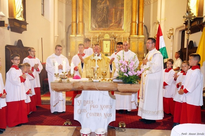 Rövid énekpróbát követően este hat órakor kezdődött az ünnepi szentmise, melyet Beer Miklós aranymisés váci megyéspüspök mutatott be Szalai Gábor, Németh István és Boldvai M. Bertalan OPraem koncelebrálásával. A bevonulási ének után elsőként a helyi egyházközség képviselője köszöntötte a püspököt, ezután Csorba János nagycenki polgármester üdvözlő szavai következtek, majd Szalai Gábor helyi plébános olvasta fel Veres András győri megyéspüspöknek a találkozóra küldött levelét.