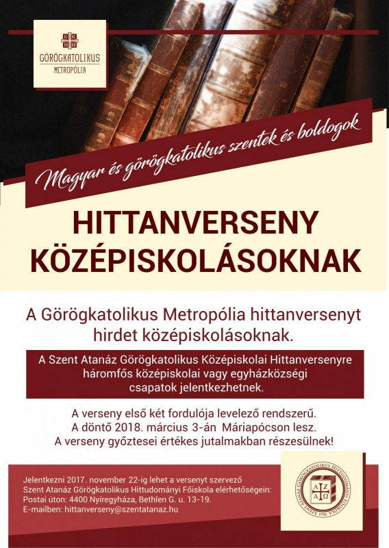 Jelentkezni november 22-ig a Szent Atanáz Görögkatolikus Hittudományi Főiskola elérhetőségein lehet postai úton (4400 Nyíregyháza, Bethlen G. u. 13–19.) vagy interneten keresztül (hittanverseny@szentatanaz.hu).