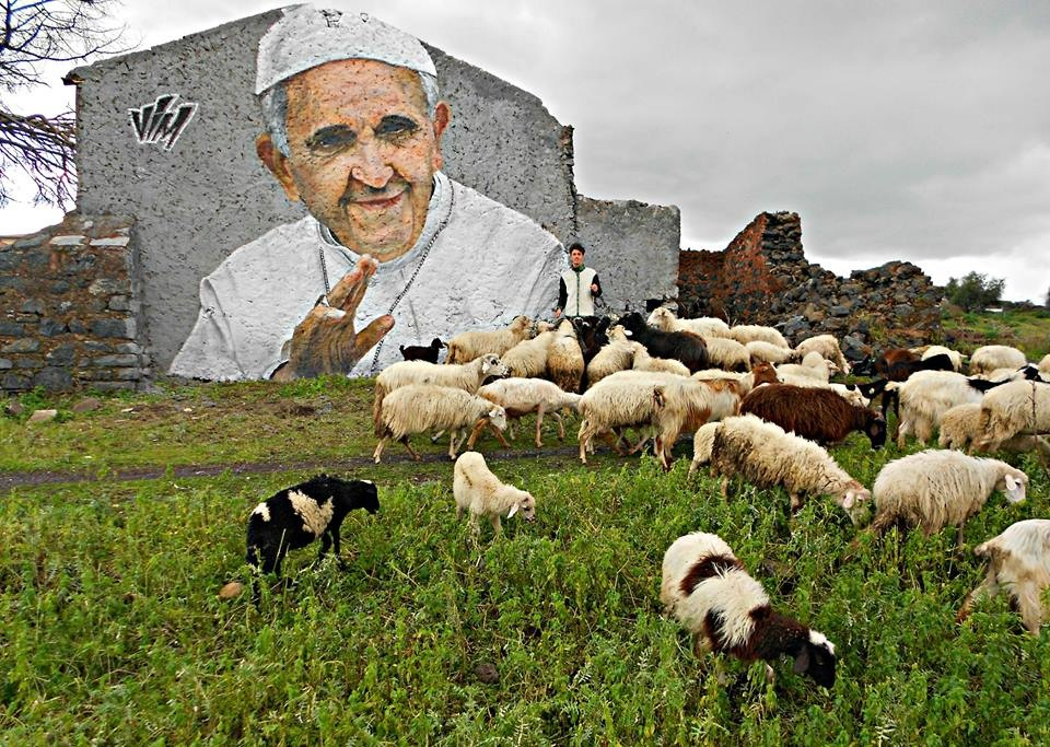 Vincenzo Magno a világ egyik peremvidékén festette meg a pápát: a szicíliai Catania közelében, egy elhagyott, romos ház falán, amelyet már korábban is „díszített” egy jóval kevésbé vonzó rajz.