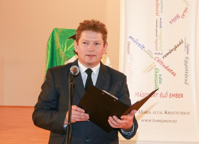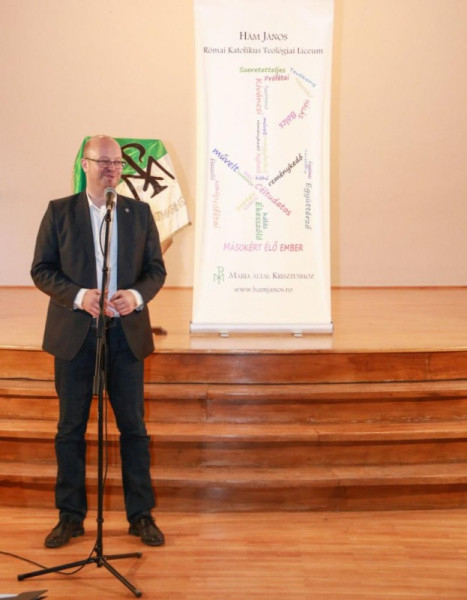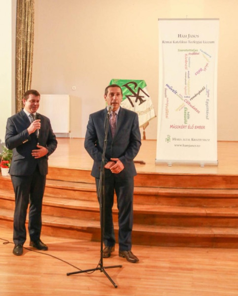 Az iskola diákjainak előadása után Soltész Miklós államtitkár köszöntőbeszédében így fogalmazott: „Ha a katolikus iskola termeit bővítjük, ha kollégiumát hozzuk rendbe, ha egy óvodát újítunk fel, akkor azt a törekvést szolgáljuk, hogy a kereszténység megmaradjon, és itt, közöttünk éljen. De törekvésünk azt az üzenetet is hordozza, miszerint a kereszténységben összetartozunk. Fontos azt tudni, hogy akár római katolikus, görögkatolikus, ortodoxiában élő vagy protestáns keresztények vagyunk, a cél egy. Sokkal több az, ami minket – magyarokat, románokat, vagy bármilyen nemzethez tartozókat ebben a térségben – összeköt, mint ami szétválaszt. A felelősségünk óriási: hogy a kereszténységet szolgáló keresztény fiatalokká tudjuk a gyermekeket nevelni. Hogy Románia hűséges és becsületes állampolgárainak, a magyarságban megmaradó felnőtteknek tudjuk a gyermekeket nevelni.”