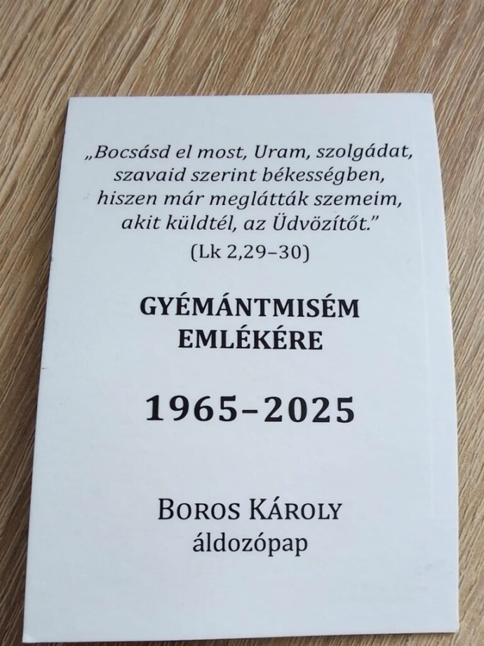 Boros Károly atya abban a templomban mutatta be a legszentebb áldozatot, ahol 1984 és 2012 között, 28 éven keresztül szolgálta Istent és az embereket. A zsúfolásig megtelt plébániatemplomban a hívek meghatódottan várták, hogy egykori papjuk bemutassa gyémántmiséjét. 28 esztendő nem kis idő, sokakat Boros Károly keresztelt, készített fel az elsőáldozásra, bérmálásra, az esküvőre, indított el a hivatás útján, hirdette az öröm evangéliumát. Sokak hozzátartozójának temetésén ő mondta a gyászbeszédet és kísérte el az utolsó útra.