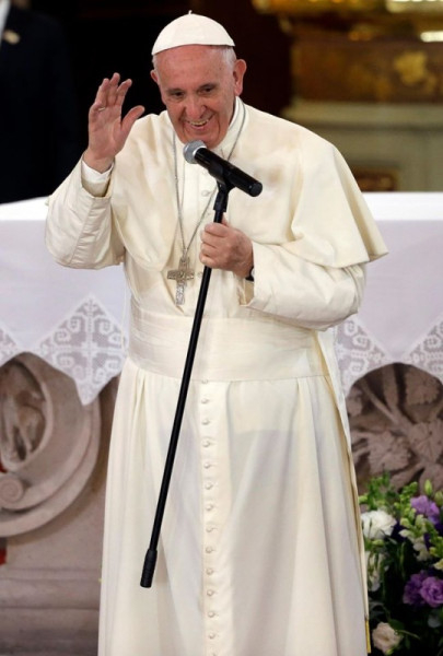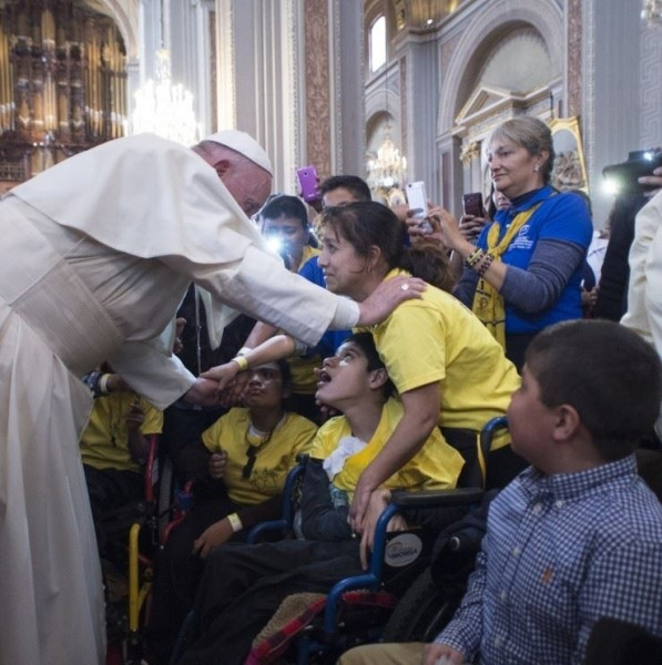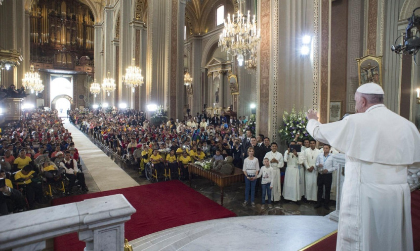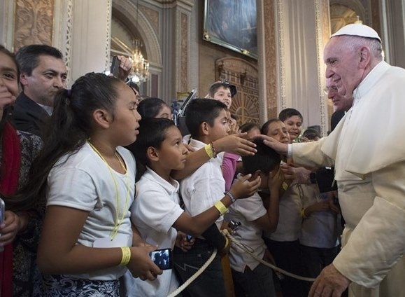 Ferenc pápa előbb a sekrestyében egyetemi rektorok egy csoportjával és mexikói keresztény felekezetek vezetőivel találkozott. Ezután rögtönzött szavakkal köszöntötte a gyerekeket. Így tanította őket: ahhoz, hogy jó keresztények legyünk, mindenek előtt szeretni kell Istent és embertársainkat úgy, mint önmagunkat.