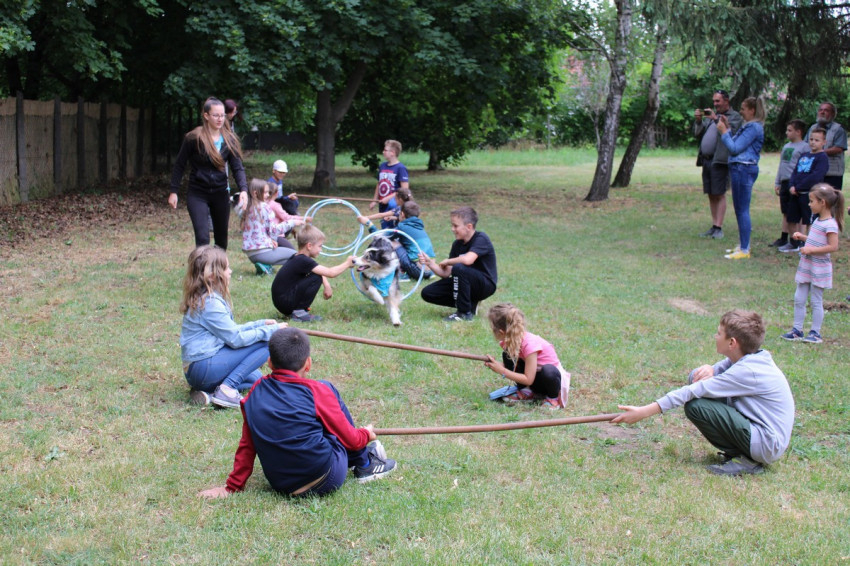 A résztvevők többek között a FalkaLand Agility Team előadását láthatták, melyben kutyatánccal, illetve agility ügyességi feladatokkal szerepeltek az ügyes négylábúak és trénereik, akik később a gyerekeket és a két hitoktatót is bevonták a kutyás feladatokba.