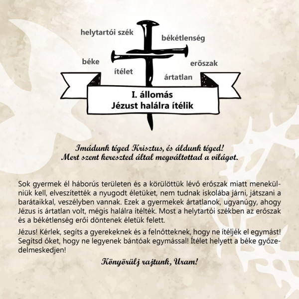 A pápai felajánláshoz csatlakozó keresztutat a békéért ajánlják fel, ezzel bevonva a gyermekeket a tevékeny szeretet szolgálatába. Így ők is átélhetik, hogy senki nem tehetetlen a háborúval szemben: imádsággal hozzájárulhatnak a békéért történő erőfeszítésekhez, akár a templomokban, akár az iskolai hittanórákon.