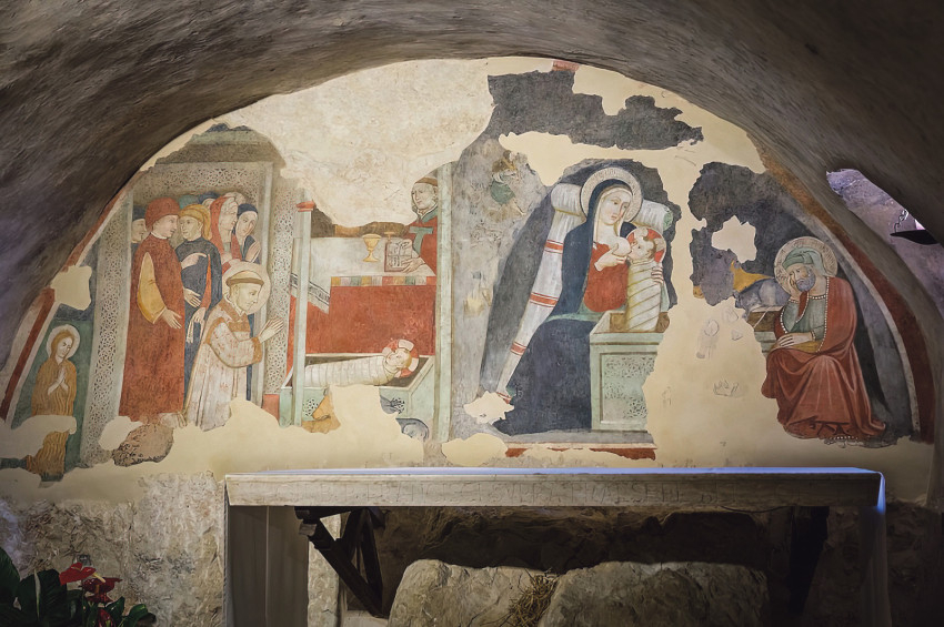 Közép-Itáliában, Róma és Assisi között körülbelül félúton egy hegy oldalában található Greccio. A kis település határában lévő barlangot látta megfelelőnek Ferenc az éjféli mise megtartására, amihez, mivel nem templomban történt, külön engedélyre volt szükség. A nyitott, barlangszerű vájatban kápolnát alakítottak ki. Ebben a barlangnyílásban ma már látható egy freskó, amely megörökíti a ferences karácsonyt a betlehemi születéstörténettel együtt. A leírások szerint Ferenc megkért egy bizonyos János urat, hogy hozzon oda állatokat is, mert így válik láthatóvá, ahogy a Gyermek „jászolban fekszik, az ökör és a szamár előtt a szénán”. Celanói Tamás, Ferenc első hivatalos életrajzírója nagyon szépen elbeszélve örökítette meg ezt az eseményt.