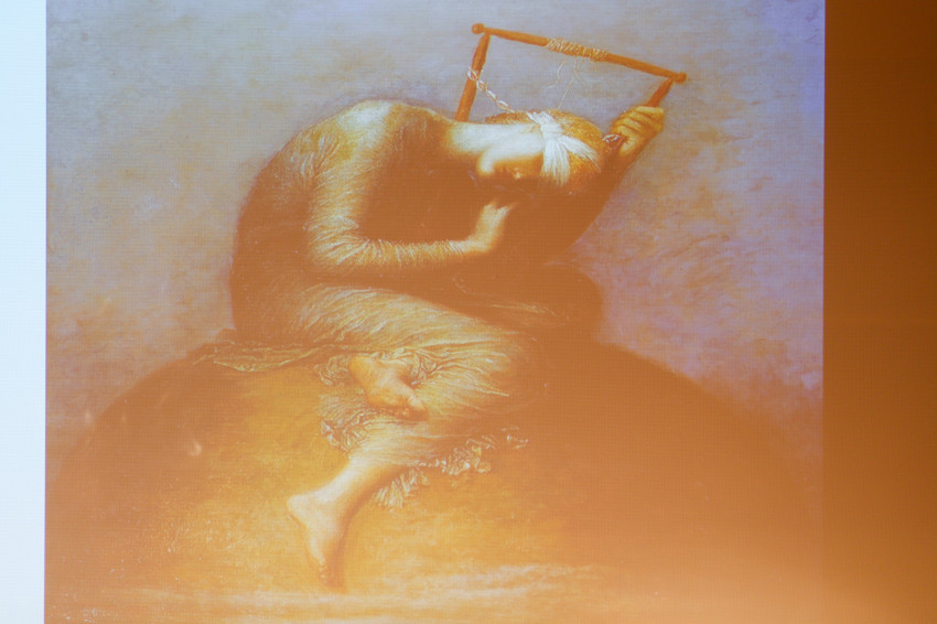 A festmény egy nőalakot ábrázol, aki görcsösen egy hangszerbe kapaszkodik, melynek csak egyetlen húrja maradt ép. Ez az egy is képes arra, hogy megszólaltasson egy dallamot. Mindegy, hogy többségben vagy kisebbségben vagyunk-e. Képesek vagyunk harmóniát teremteni, változást előidézni, még akkor is, ha csak egy húrt tudunk megpendíteni – biztatott.