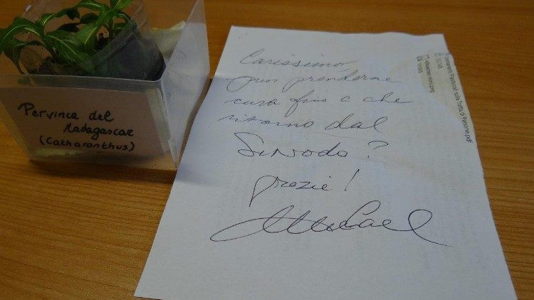 Október 4-én, pénteken – emlékszem, éppen Szent Ferenc emléknapján – későn este a rádióból jövet, valamiféle csomagot látok a rendházunkban, az ajtóm előtt. Közelebb lépve látom: kicsi virág, műanyag dobozkában. Alatta kézírásos üzenet olaszul: „Carissimo, gondodba tudnád venni ezt a virágot, amíg visszajövök a szinódusról?! Köszönöm, Michael”.