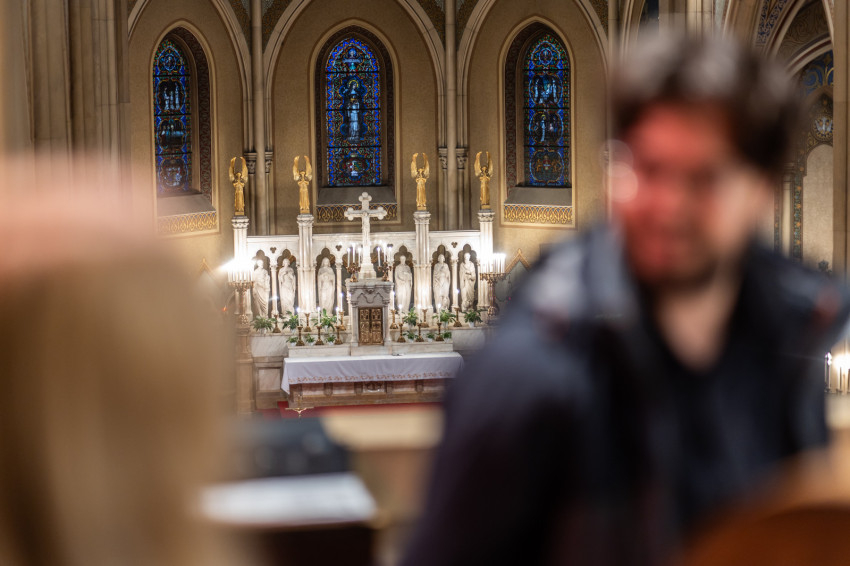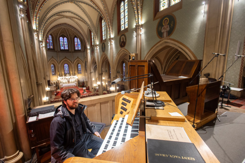 Fél tizenkettőtől huszonöt percen keresztül folyamatosan szól a zene: öt-hat adventi és karácsonyi éneket – mint a Veni, veni Emmanuel, a Mostan kinyílt egy szép rózsavirág, az In dulci jubilo, az Adeste fideles – improvizációval kötök össze. A próbákon lemérjük az énekek hosszát, és felírom, percre pontosan mikor kell megérkeznem abba a hangnembe, amelyben a következő ének van. Olyan ez, mint egy zenei szőnyeg, szinte észre sem vesszük, ahogyan az egyik ének átmegy a másikba. Az utolsó mindig a Csendes éj. Végig visszafogottan használom az orgonát, így csodálatos a kontraszt, amikor megszólal a szentmisén a csengő és tuttiban az orgona, majd elénekeljük a Mennyből az angyalt. Tavaly szólaltattuk meg először az áldozás után a Nagy örömnap ez a nap, Messiásunk támadt kezdetű népéneket, amit nagyon megszerettem. A maga egyszerűségével gyönyörűen kifejezi a magyar ember karácsonyképét. Tavaly az érintett meg a leginkább, ahogyan Zsolti ezt énekelte. Akkor ez volt a karácsonyom, ez az ének.”