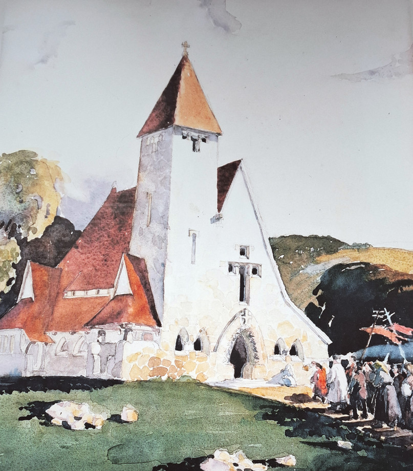 Szembeötlő az egyik falon a zebegényi templom madártávlati képe, Kós akvarellje. Ez az emblematikus épület szinte a védjegyévé vált, akárcsak az állatkert, de arról majd később. Feljebb azt írtuk, hogy mindent maga tervezett – ez így is volt, főként a családi házak esetében. A nagyobb megbízásokon azonban társakkal dolgozott.