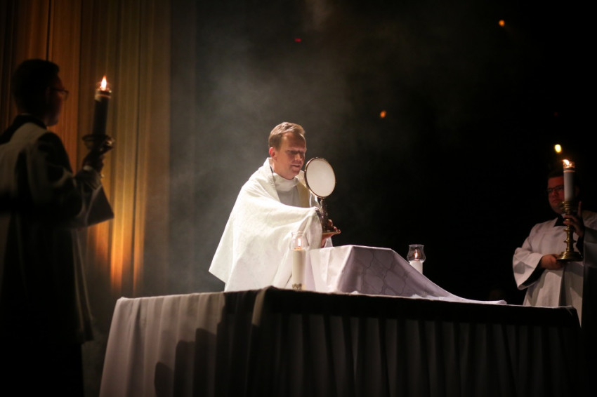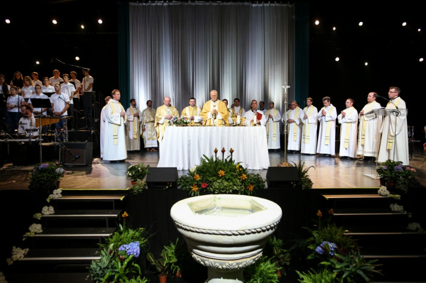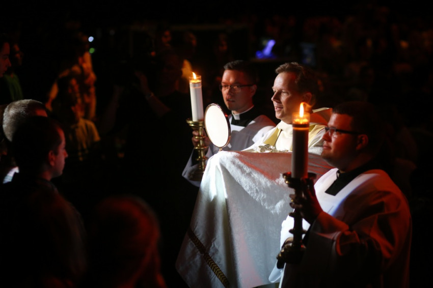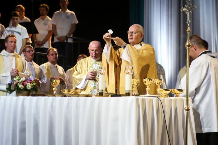 A szentmisére kigyúltak a csarnokban a fények, megváltozott a színpadi installáció. Hosszú sorban vonult be a papság az asszisztenciától kísérve. A főcelebráns és szónok Erdő Péter bíboros, prímás volt, koncelebrált többek között Palánki Ferenc püspök, az MKPK ifjúsági bizottságának elnöke.