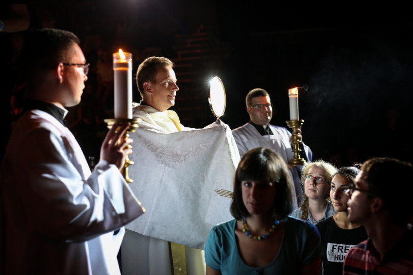 A zenével-énekkel, dicsőítéssel kísért, hosszabb csendeket tartó szentségimádás folyamán a fiatalok imakéréseiket papírra jegyezték, és elhelyezték az oltár előtt. A végén Fábry Kornél esztergomi papnövendékek által kísérve, az Oltáriszentséget körbehordozva a teremben megáldotta a jelenlévőket.
