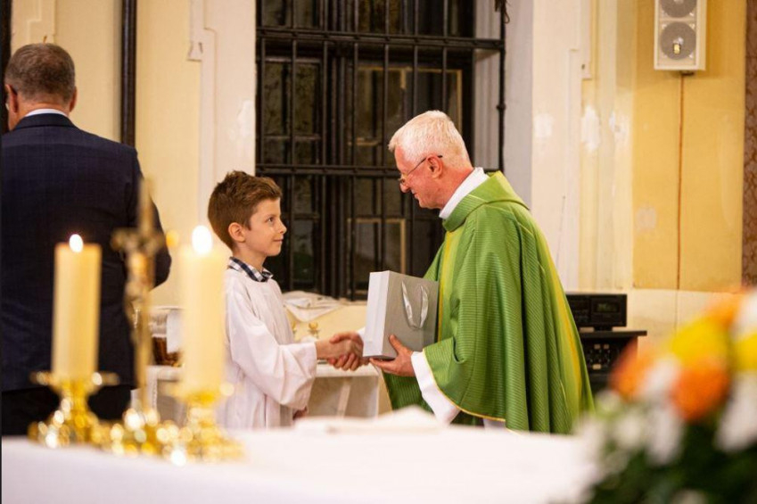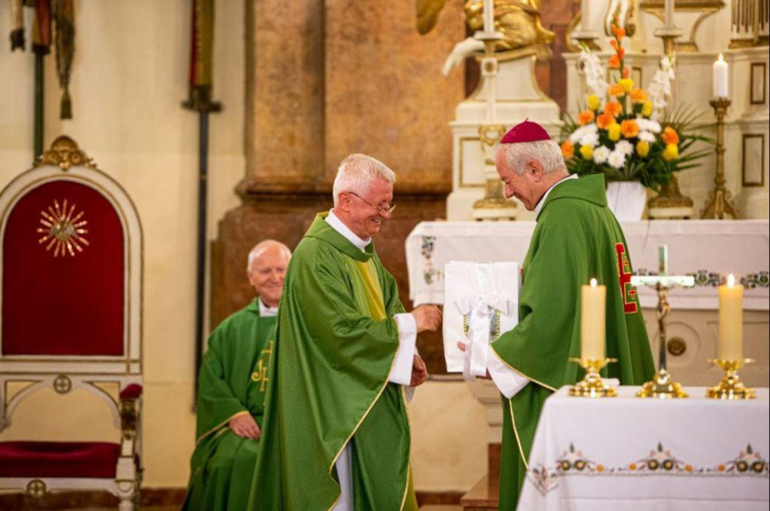 A püspök a Szeged-Csanádi Egyházmegye nevében szimbolikus ajándékot nyújtott át Kovács Péter atyának.
