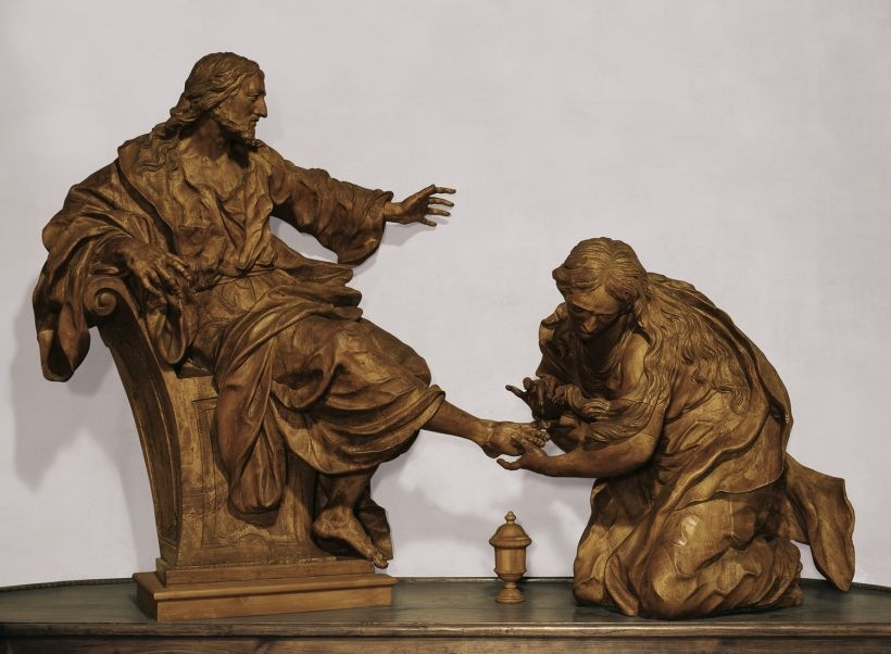 Giovanni Giuliani alkotásán Mária Magdolna a hajával szárítja Jézus lábát