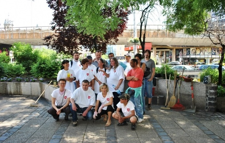 A környezet szépítését célzó, immár sokadik akció húsz önkéntessel indult, de a munkába bekapcsolódtak a téren pihenő hajléktalan emberek is.
