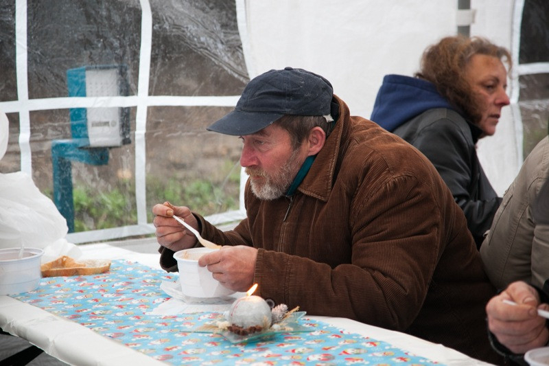 Tampu-Ababei József rákosligeti plébános és Újházy Lóránd rákoskeresztúri plébániai kormányzó vezetésével a helyi karitászcsoportok emellett forró teával és zsíros kenyérrel is megvendégelték őket. A meleg étel és a jó szó mellett fenyőfát is kaptak a családok, valamint édes és sós péksüteményt, almát és kenyeret.