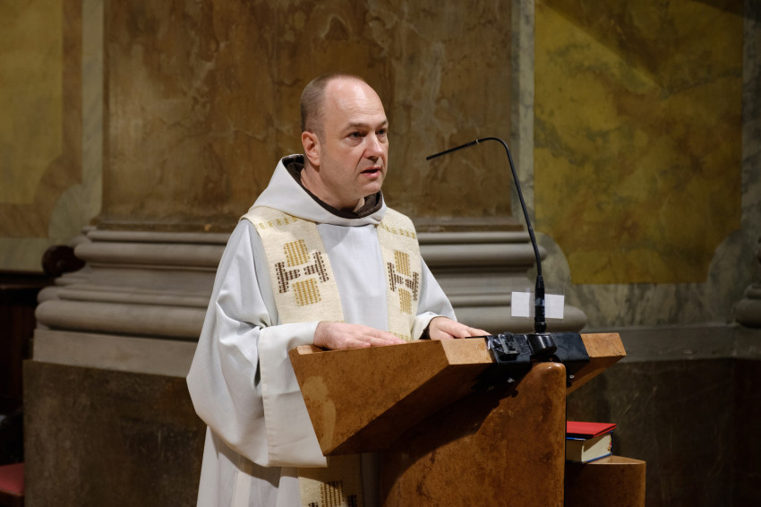Kálmán Peregrin OFM, a pesti ferences templom igazgatója az ünnepi szentmise előtt köszöntötte a nagyatádi, a szombathelyi és az esztergomi híveket – ezeken a településeken is szolgált egykor Hajnal Zénó.