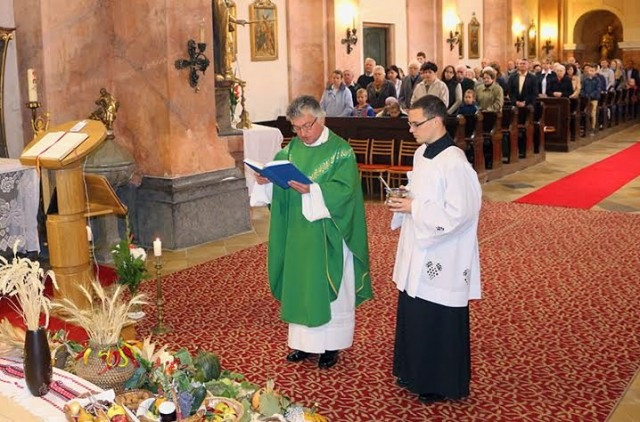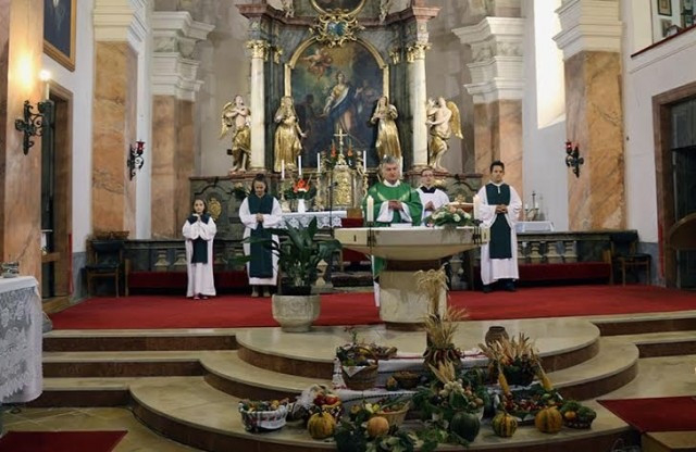 A plébániatemplomban főleg a helyi Kolping Család tagjai készítettek díszes, sokféle és sokszínű zöldséggel és gyümölcsökkel gazdag kosarakat az oltár elé, melyek megáldására a vasárnap délelőtti szentmisében került sor.