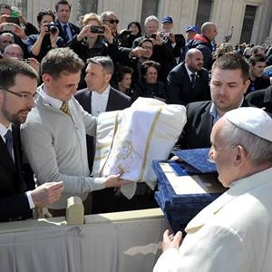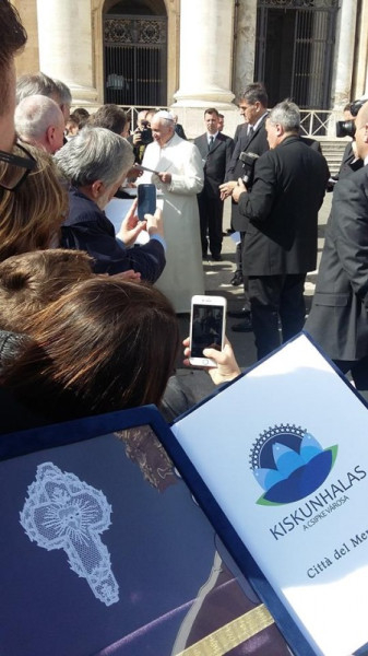 Az általános kihallgatáson Kiskunhalas város nevében Kuris István László önkormányzati képviselő és Vida Jácint Ferenc, a Szent József Katolikus Általános Iskola pedagógusa halasi csipkével díszített liturgikus terítőket adott át a pápának, továbbá egy pápabábut, amely a gyermekek ajándéka. A szombati audienciára Habsburg-Lotharingiai Eduárd szentszéki nagykövet és Érszegi Márk Aurél követségi első beosztott kísérte el az alföldi település küldötteit.
