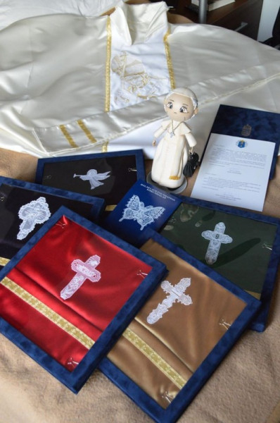 A kiskunhalasiak a nagyböjtre felajánlott tövises csipkekereszt mellett négy olyan alkotást hoztak, amelyek keresztet, illetve egy trombitás angyalt formáznak. A liturgikus színeknek megfelelő textíliákra applikálták a csipkéket a kiskunhalasi csipkevarrók. Ezeket a Szent Márta-ház kápolnájába szánják. Az ambóterítők mellett egy miseruhát is átadtak Ferenc pápának. Ezen Szent II. János Pál hímzett arcképe látható, amely az kiskunhalas-alsóvárosi főplébánia magánadományaként érkezett Rómába. A csipkék a város, a trombitás angyalt ábrázoló alkotás pedig készítőjének ajándéka – hangsúlyozta Kuris István László.