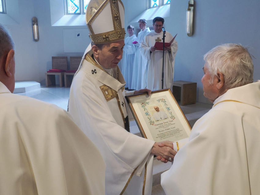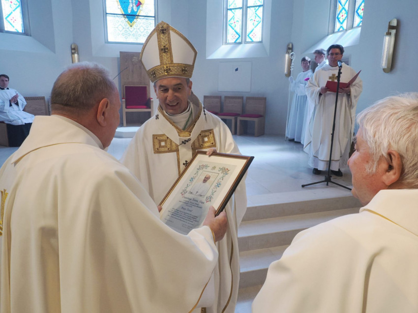 Hálát adunk azért, hogy a lelkesedés fenntartásában, a nehézségek vállalásában, a helytállásban az egységet munkáltátok és az egységből merítettétek az erőt. Veletek együtt köszönjük meg az elmúlt évtizedek szolgálatát. „Én magam püspök elődeim és a reátok bízott hívek nevében mondok köszönetet és köszönöm meg a papi hivatás szolgálatának megélését.” Jézus Szentséges Szíve, e titok, mely papságunknak is szimbóluma, erősítse az egységet és a szándékot az együttműködésre és az együtt szolgálatra – fogalmazott a főpásztor.
