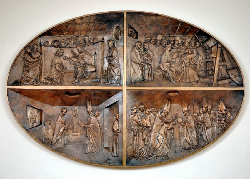 A magyar kápolna hátsó falán lévő bronz domborművön, Amerigo Tot (Tóth Imre) alkotásán VI. Pál személyében immár egy boldog pápa képe is látható a szent pápa, II. János Pál mellett.