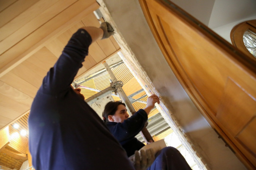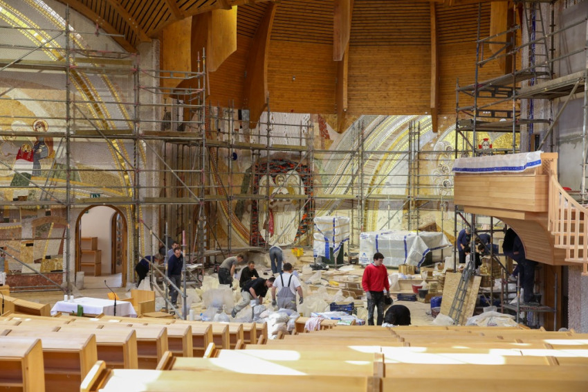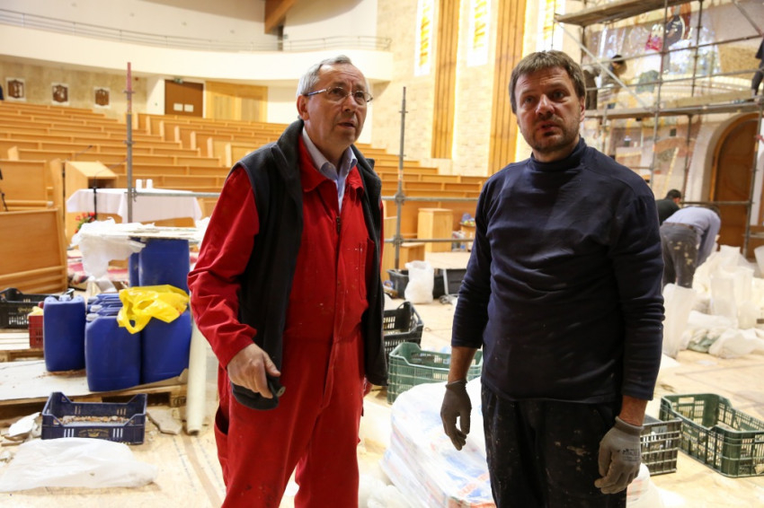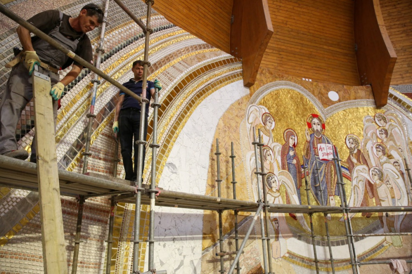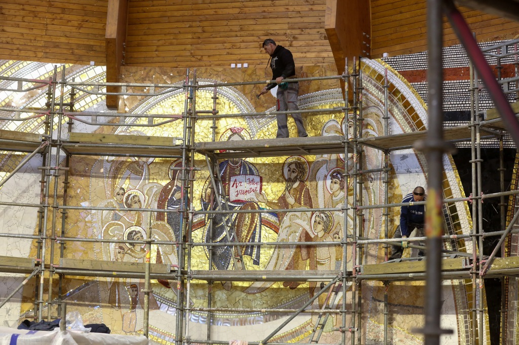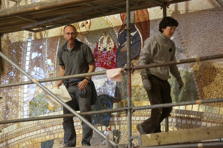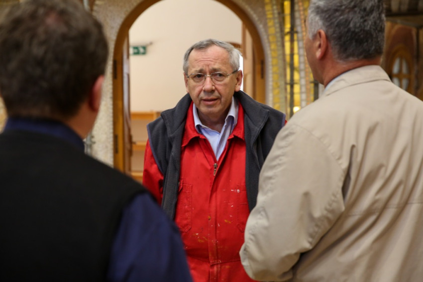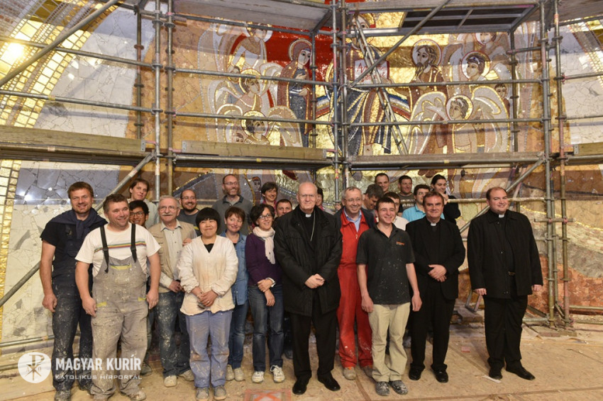 Erdő Péter bíboros május 16-án, munka közben látogatta meg és találkozott Marko Rupnik jezsuita művésszel és csapatával (Fotó: Mudrák Attila).