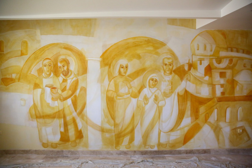 – Az egyik oldalon azt a kemencét ábrázoltuk, amelybe – Dániel könyvének leírása szerint – Nebukadnezár király belevettette a három ifjút, mert nem hódoltak az aranyszobor előtt. A kemencében ott van az angyal is, aki Jézus előképe, aki megvédte a három ifjút a tűztől, sértetlenek maradnak. A bizánci keresztény hagyományban nagyszombaton a pokolra szállást ünneplik a szentmisében. Nagypénteken Krisztus meghal, szombaton az egyház alászáll vele a poklokra, a halál birodalmába, ahonnan nem jön vissza, hanem egy másik úton megy fel és belép Isten országába. A három ifjú a mozaikon a szent három nap színeit viseli: a nagypénteki szenvedés, a kereszthalál és a feltámadás színeit. A szent három nap az az út, amelyen keresztül mi, keresztények sértetlenek maradunk a világ gonoszságával szemben. Nem úgy, hogy harcolunk a világ ellen, hanem úgy, hogy Krisztussal egyesülve áthaladunk a húsvét útján. Az angyalok leszállnak velünk a nehézségek, a veszélyek helyére, hogy megvédjenek.