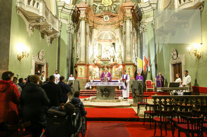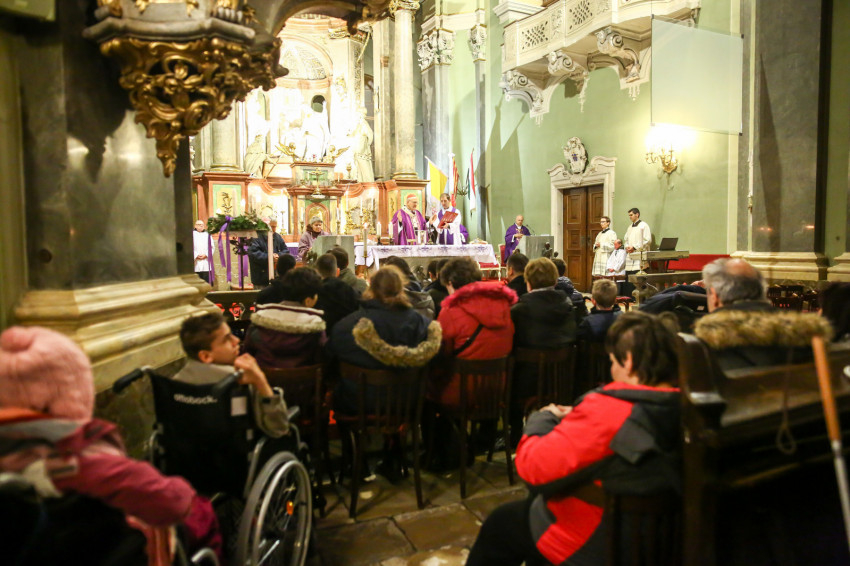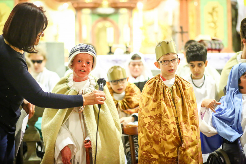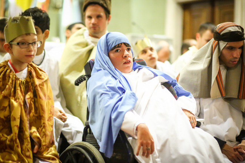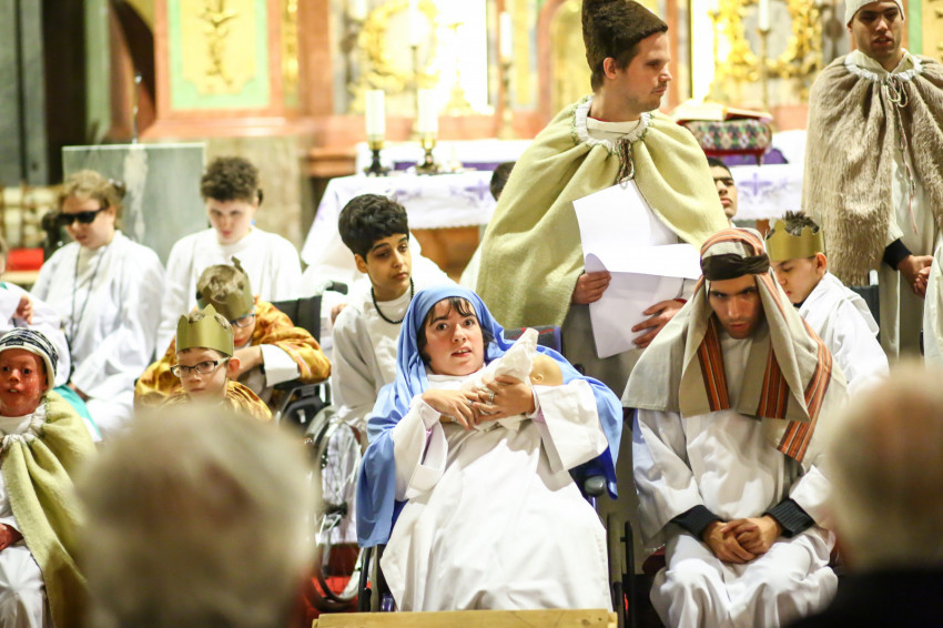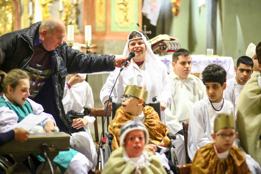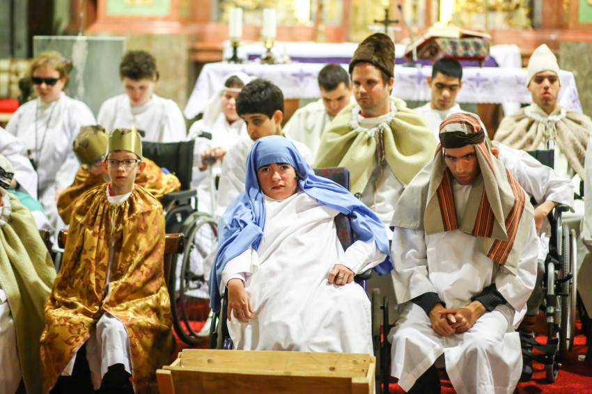 A szentély előtt felállított székeken jelmezes gyerekek, fiatalok. Középen fiatal lány, kék fátyolban, kerekesszékben. A padokban a felnőttek között egy csapat piarista diák, akiket a közösségi szolgálat – ahogy náluk nevezik, a Tevékeny Szeretet Iskolája, a TESZI – vitt segítőként a gyerekek közé, és kispapok, a Központi Szeminárium növendékei. Különleges ajándékot kaptak ezen a karácsonyváró ünnepen. Az otthon lakói betlehemessel készültek. 1977 óta, amikor első közös szentmiséjükön vehettek részt, havonta ünnepelnek együtt szentmisét, és karácsonykor minden évben Erdő Péter bíborost várják körükbe.