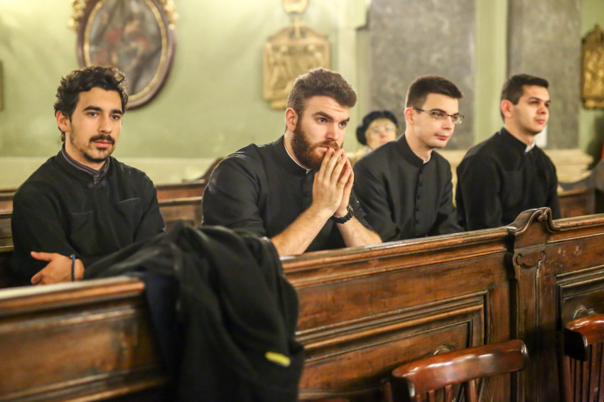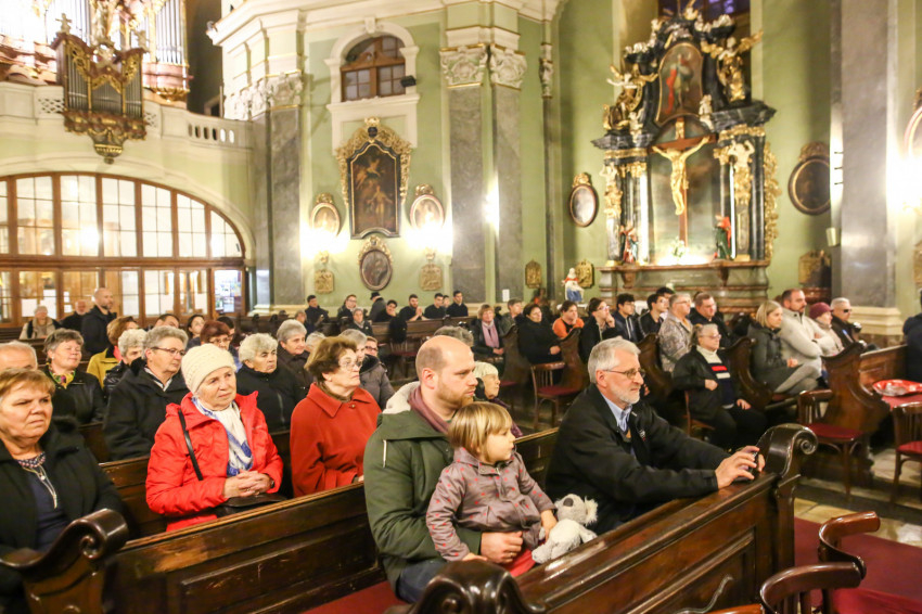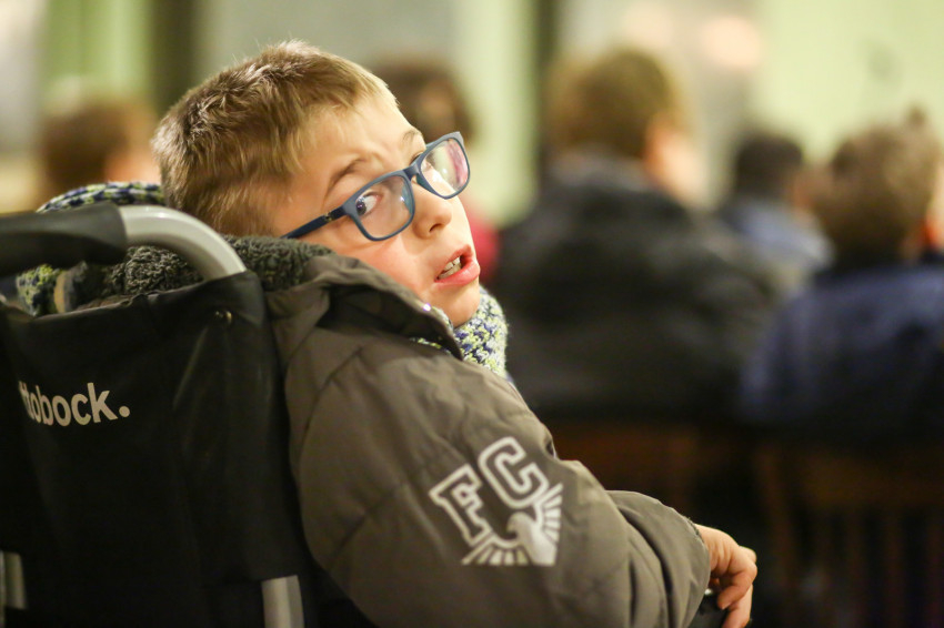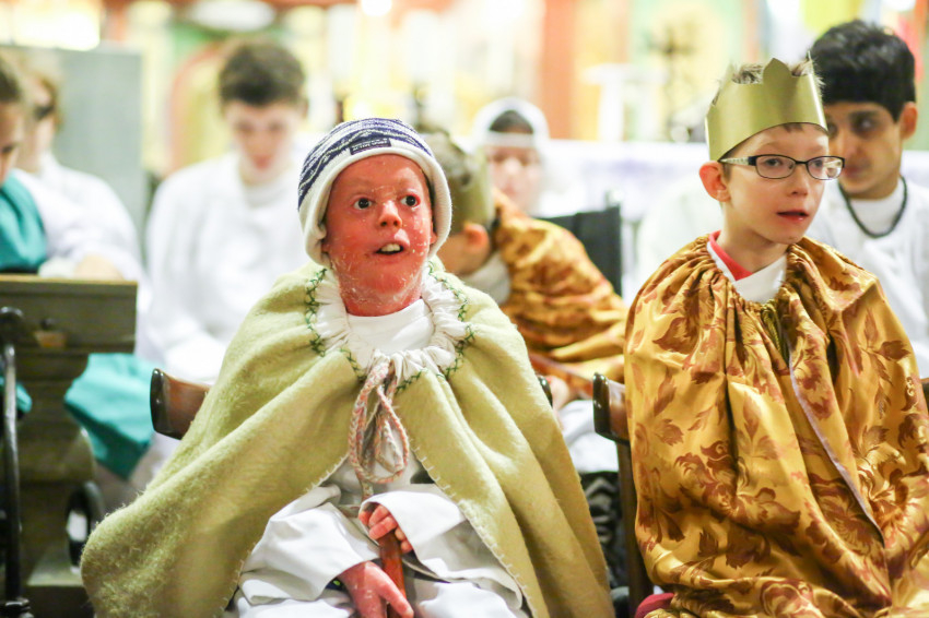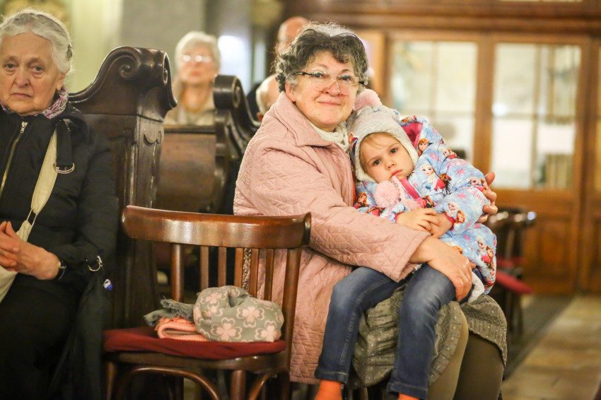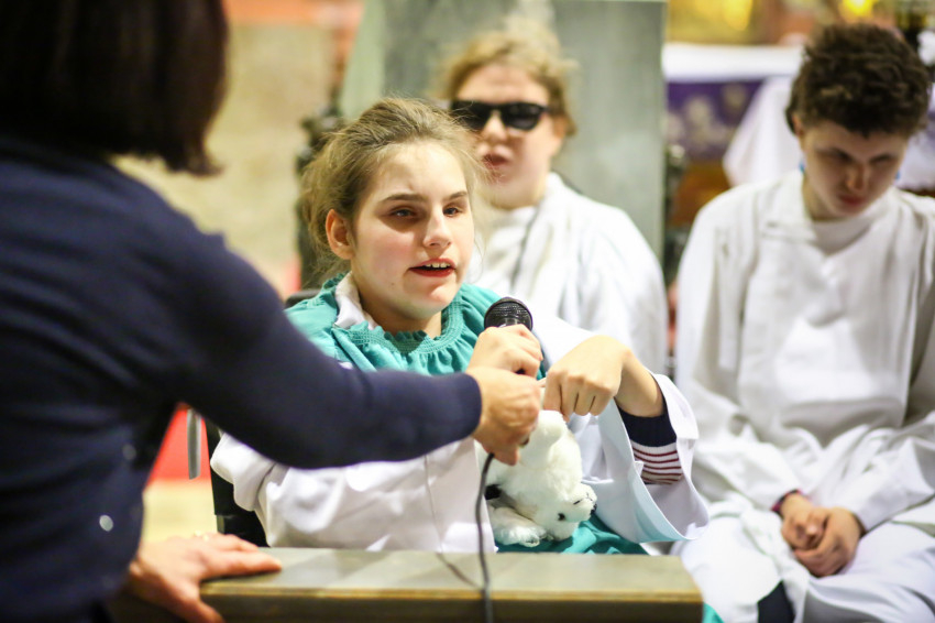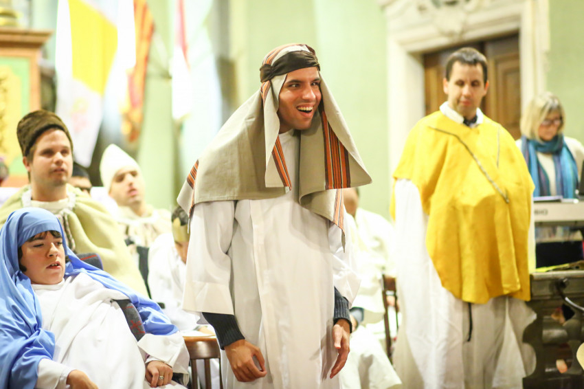 A szentély előtt felállított székeken jelmezes gyerekek, fiatalok. Középen fiatal lány, kék fátyolban, kerekesszékben. A padokban a felnőttek között egy csapat piarista diák, akiket a közösségi szolgálat – ahogy náluk nevezik, a Tevékeny Szeretet Iskolája, a TESZI – vitt segítőként a gyerekek közé, és kispapok, a Központi Szeminárium növendékei. Különleges ajándékot kaptak ezen a karácsonyváró ünnepen. Az otthon lakói betlehemessel készültek. 1977 óta, amikor első közös szentmiséjükön vehettek részt, havonta ünnepelnek együtt szentmisét, és karácsonykor minden évben Erdő Péter bíborost várják körükbe.