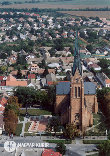 Az impozáns méretű, Nagyboldogasszony tiszteletére szentelt, neogótikus stílusú római katolikus templom 1899–1902 között épült, terveit Hofhauser Antal készítette. Helyén állt Magyarország első ciszterci apátsága, amit a tatárok felégettek, majd 1347 körül épült újjá. A templom a török korban részben elpusztult, a romokra épült rá 1726–1750 között egy barokk templom, amit a 20. század első éveiben elbontottak.
