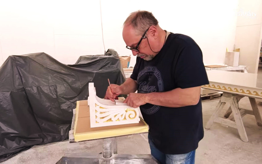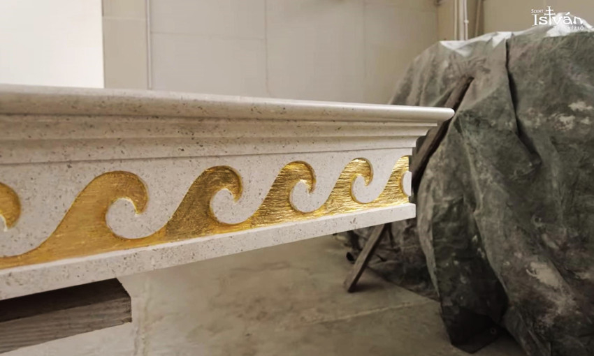 A soron következő fontos lépés, hogy hamarosan a helyére a kerül az egri bazilika oltára, így ezúttal Gizella János, a Kőművészet Kft. ügyvezető igazgatója mutatta meg munkatársai közreműködésével a pilisszentiváni kőfaragóműhelyben – ahol a bazilika liturgikus elemeinek gyártása, megújítása történik –, hogyan is készül az új oltár konzoljának aranyozása.