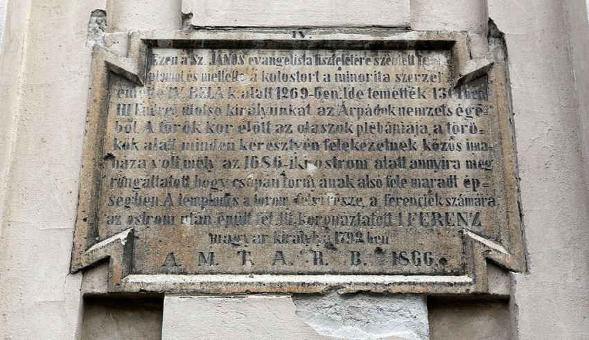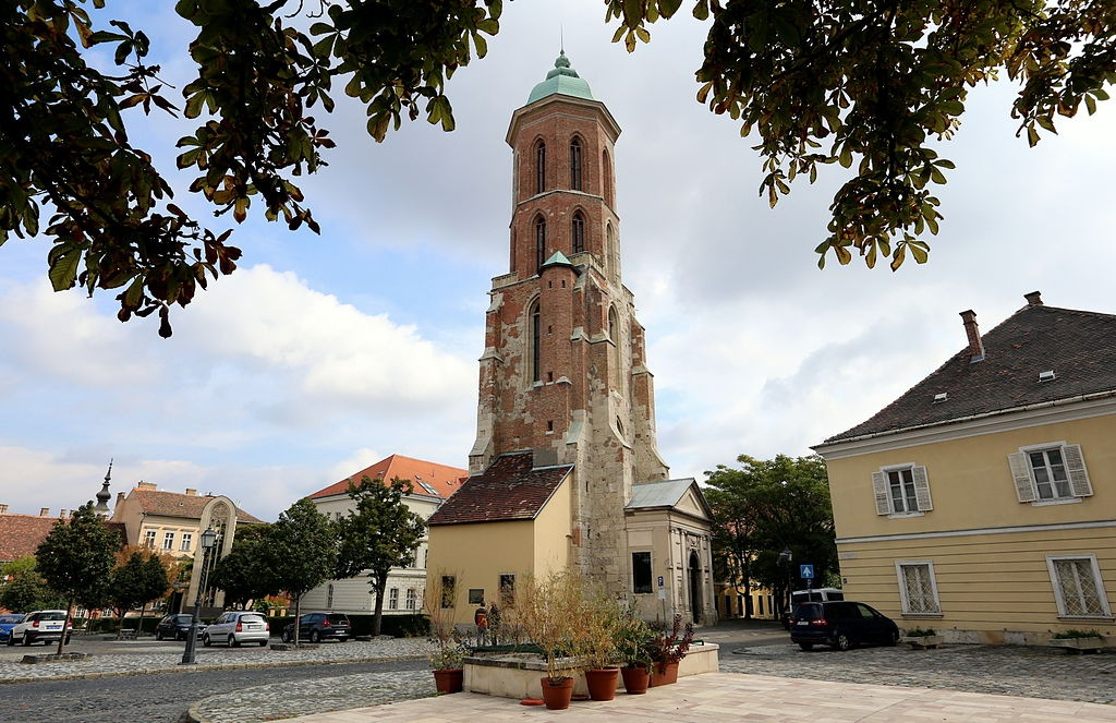 Az egyházközség a 13. század közepén, közvetlenül a város alapítását követő időben jött létre, templomuk ekkor még a Boldogasszony-plébánia (Mátyás-templom) kápolnájának számított. Az első templom a régészeti ásatások tanúsága szerint kicsiny, egyenes szentélyzáródású, egyhajós épület volt. A 14–15. század fordulóján a magyar polgárság számbeli és anyagi növekedésével párhuzamosan elnyerte egyházközsége számára az önálló plébánia rangját, és elkezdte templomának nagyszabású átépítését. A munkálatok a 15. század végére zárultak le, ekkorra épült fel teljesen a hat boltszakaszból álló háromhajós, nyújtott szentéllyel rendelkező késő gótikus épület nyugati homlokzatának tengelyében az ötemeletes toronnyal. A hajó belső terének bazilikális elrendezése és méretei ma is jól megfigyelhetők a torony templom felőli oldalán. A török időkben itt működött a Vár egyetlen keresztény temploma, amelyet megosztva használtak katolikusok és protestánsok. A tizenöt éves háború (1591–1606) idején elvették a keresztényektől az épületet, és ezután mint muzulmán imahely Fetih (Győzelem), illetve Szaát (Órás) dzsámi néven volt ismert.