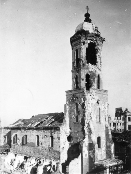 1945-ben, Budapest ostromakor az épület súlyosan megrongálódott. A hajó és a szentély boltozatai beszakadtak, a torony legfelső szintjét belövés lyukasztotta át. A romok alatt maradtak a templomi berendezések és oltárok, a legtöbb tárgy elpusztult. Bár az ostrom után közvetlenül megkezdődött a templom újjáépítése, a megváltozott politikai helyzet azonban már nem tette lehetővé a teljes helyreállítást. A tábori püspökség megszüntetésével a templom fenntartó nélkül maradt. Sajnos a műemlékvédelem szempontjait csak a gótikus torony esetében sikerült érvényesíteni. A súlyos sérüléseket szenvedett torony helyreállítása 1950-ben megkezdődött, ezzel egy időben a templom épületét szakaszonként lebontották.
