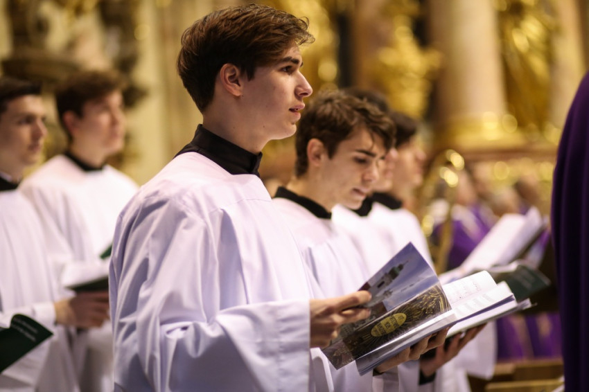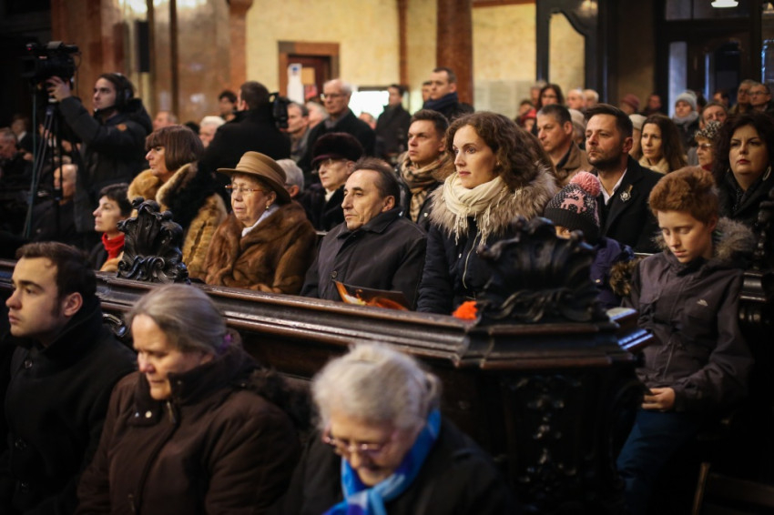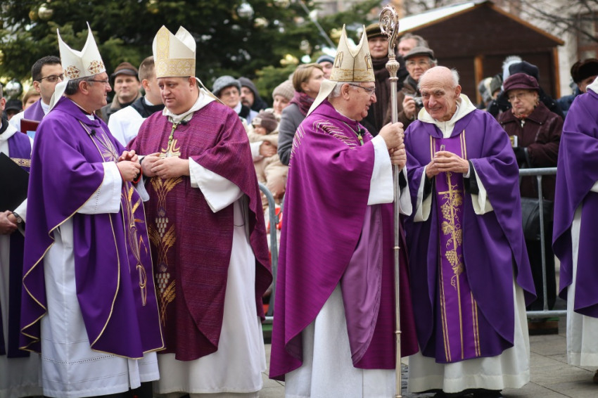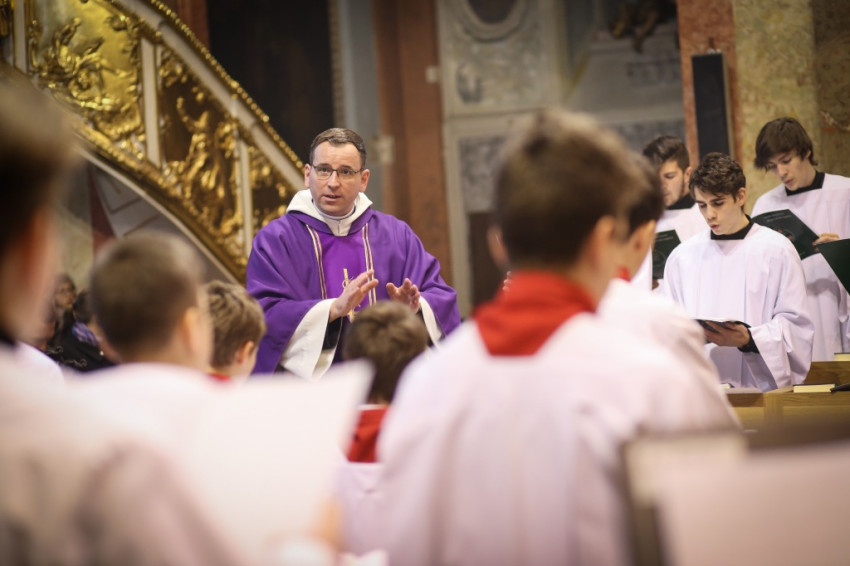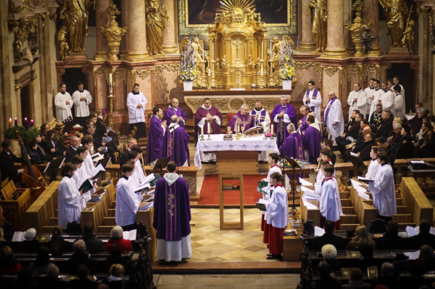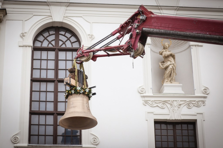 A felszentelési liturgiát követő szentmise főcelebránsa Várszegi Asztrik volt. A pannonhalmi főapát homíliájában a harangok történetét történelmi kontextusba helyezte, párhuzamba állította a győri harangok és a moszkvai Megváltó Krisztus-székesegyház sorsát, emlékezve Horváth Dori Tamásra, akivel egy közös utazás alkalmával lehettek a moszkvai katedrális újraépítésének tanúi. Várszegi Asztrik kiemelte, a bencés rend 1802-ben történt visszaállítását követően Győrben a Jézus Társasága örökébe lépett azzal, hogy átvette a Loyolai Szent Ignác-templom és a hozzátartozó oktatási intézmény fenntartását. A pannonhalmi főapát emlékeztetett Bonaparte Napóleon 1809-es győri tartózkodására is. Várszegi Asztrik rámutatott arra, hogy Napóleon erőszakos nacionalizmusával egy olyan folyamatot indított el, amely csak az első világháború végén bontakozott ki: a „dinasztiák Európájának” felbomlasztása a „nemzetek Európájának” létrejöttét eredményezte. A főapát felhívta a figyelmet arra, hogy a győri bencés templom négy harangját az első világháború idején rekvirálták el.